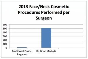 To illustrate, consider the average number of surgical procedures to firm the face and neck done by traditional plastic surgeons versus Dr. Machida.  According to the American Society of Plastic Surgeons 2013 Plastic Surgery Statistics Report, in 2013 a total of 24,500 plastic surgeons performed 404,307 facelifts, neck lifts and eyelid surgeries – the same kinds of surgical procedures Dr. Machida does at Second to Creation.